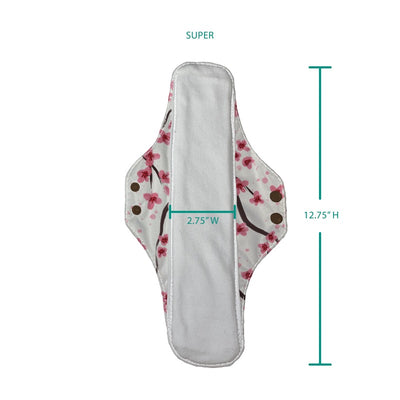 Thirsties new Organic Cotton Menstrual Pads are here! Waterproof TPU protects undergarments with two secure snap fasteners. Liners have 4 layers of 100% GOTS-certified organic cotton, Regular has 5, and Super has 6 layers for ultimate protection. They are sold in a 2-pack bundle that includes each print.