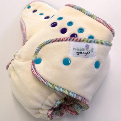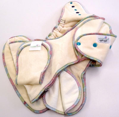 All Twinkie Tush diapers stocked by Jillian's Drawers are serged at the outer seams. For the OBV Night-Night, all diapers come in natural color with rainbow stitching and purple and aqua snaps.